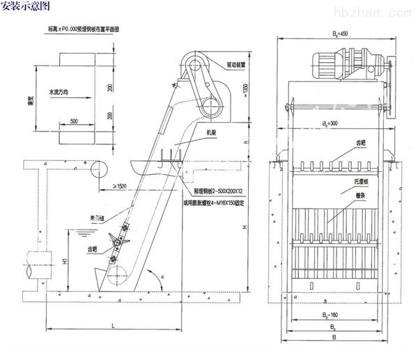 按水流方向耙齒鏈類同于格柵,在耙齒鏈軸上裝配的耙齒間隙可以根據(jù)使用條件進(jìn)行選擇。當(dāng)耙齒把流體中的固態(tài)懸浮物分離后可以保證水流暢通流過。整個(gè)工作過程是連續(xù)的,也可以是間歇的。